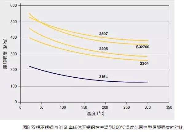 1)高強(qiáng)度:雙相不銹鋼力學(xué)性能優(yōu)異,標(biāo)準(zhǔn)雙相不銹鋼牌號(hào)的力學(xué)性能見表A。它們?cè)诠倘芡嘶馉顟B(tài)下的室溫屈服強(qiáng)度是未添加氮的標(biāo)準(zhǔn)奧氏體不銹鋼的兩倍多,這樣設(shè)計(jì)師在某些應(yīng)用中就可減小壁厚 。圖B比較了室溫到300℃ (570℉) 溫度區(qū)間幾種雙相不銹鋼與316L奧氏體不銹鋼屈服強(qiáng)度。由于鐵素體相有475℃ (885℉) 脆性的危險(xiǎn),所以雙相不銹鋼不應(yīng)長(zhǎng)時(shí)間用于溫度高于壓力容器設(shè)計(jì)規(guī)范規(guī)定的條件 (見表2)。