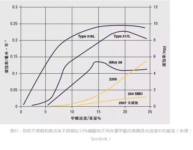 圖H顯示了在沸點(diǎn)溫度下,在50%醋酸和不同含量甲酸的混和溶液中雙相不銹鋼和奧氏體不銹鋼的腐蝕。盡管304和316不銹鋼可用于室溫和中等溫度下的強(qiáng)有機(jī)酸介質(zhì),但2205和其他雙相不銹鋼在許多涉及高溫有機(jī)酸的工藝中占優(yōu)勢(shì),而且由于它們耐點(diǎn)蝕和耐應(yīng)力腐蝕,也可用于鹵代烴工藝。