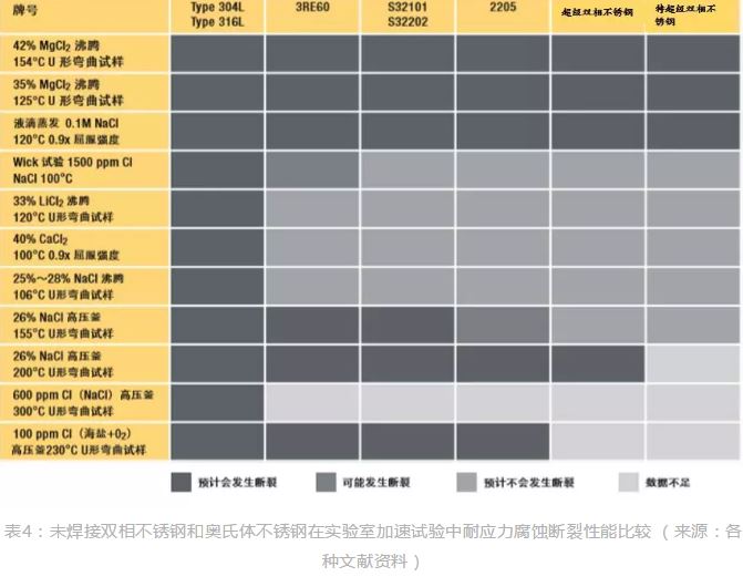 表4總結(jié)了在不同腐蝕程度的各類試驗(yàn)介質(zhì)中,幾種不銹鋼的氯化物應(yīng)力腐蝕斷裂行為。表的上部所列介質(zhì)由于含有酸性鹽而條件苛刻,表的下部由于溫度高而條件苛刻。表中間的介質(zhì)條件不那么苛刻。鉬含量小于4%的標(biāo)準(zhǔn)奧氏體不銹鋼在所有這些條件下均發(fā)生氯化物應(yīng)力腐蝕斷裂,而雙相不銹鋼能夠耐受上述中間范圍的中等試驗(yàn)條件。