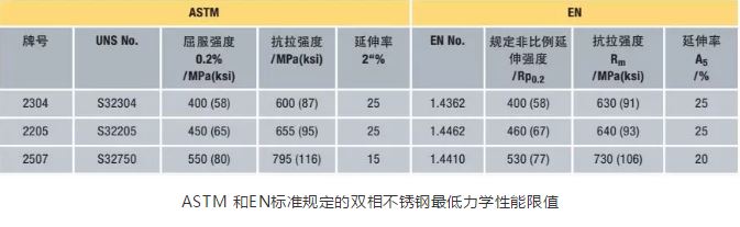 但是雙相不銹鋼的韌性和塑性通常比奧氏體不銹鋼差。奧氏體不銹鋼一般沒有塑性-脆性轉(zhuǎn)變,在低至深冷溫度的條件下仍保持優(yōu)異的韌性。表D給出了標(biāo)準(zhǔn)奧氏體不銹鋼和雙相不銹鋼在拉伸試驗(yàn)中最小延伸率的比較。