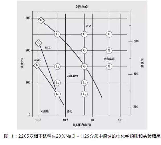 耐氫致應(yīng)力腐蝕受多種因素影響,不僅與鐵素體含量有關(guān),而且與強(qiáng)度、溫度、充氫條件、外加應(yīng)力等有關(guān)。雙相不銹鋼盡管對(duì)氫致開裂敏感,但只要仔細(xì)評(píng)估和控制操作條件,在含氫介質(zhì)中仍可以利用其強(qiáng)度優(yōu)勢(shì)。這些應(yīng)用中最突出的是輸送弱酸氣體和鹽水混合物的高強(qiáng)度管道。圖11說明了2205雙相不銹鋼在含氯化鈉的酸性介質(zhì)中不發(fā)生腐蝕和易發(fā)生腐蝕的條件范圍。