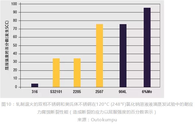 圖10給出了若干軋制退火的雙相不銹鋼和奧氏體不銹鋼在苛刻的氯化物介質(zhì)中的相對(duì)耐氯化物應(yīng)力腐蝕斷裂性能。得出這些數(shù)據(jù)的液滴蒸發(fā)試驗(yàn)腐蝕條件很苛刻,因?yàn)樵囼?yàn)溫度為120℃(248℉)的高溫,并且氯化物溶液由于蒸發(fā)而濃縮。試驗(yàn)中三種雙相不銹鋼UNS S32101、2205和2507最終在所受應(yīng)力達(dá)到其屈服強(qiáng)度的某一百分比時(shí)發(fā)生斷裂,但這一百分?jǐn)?shù)比316不銹鋼相應(yīng)的百分比值高得多。由于雙相鋼在常壓下的氯化物水溶液中能夠耐應(yīng)力腐蝕斷裂,例如耐保溫層下的腐蝕,所以在已知304和316不銹鋼會(huì)發(fā)生斷裂的氯化物介質(zhì)中,可以考慮使用雙相不銹鋼。